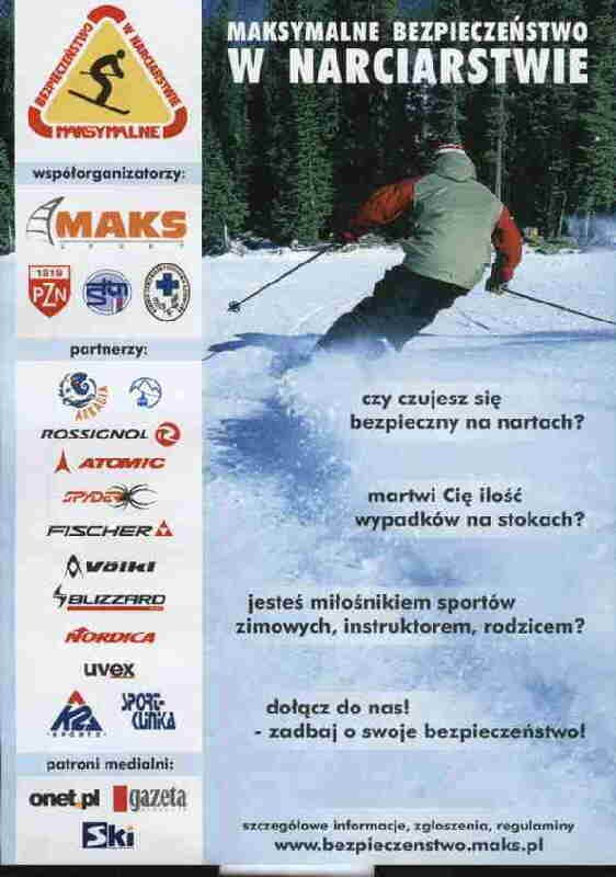 Informujemy, że 27 listopada 2004 /SOBOTA/ w Warszawie odbędzie się konferencja „Maksymalne Bezpieczeństwo w Narciarstwie”. Program znajduje się w INFORMACJACH o tej imprezie w naszym KALENDARZU.