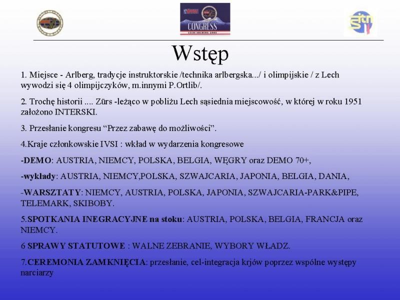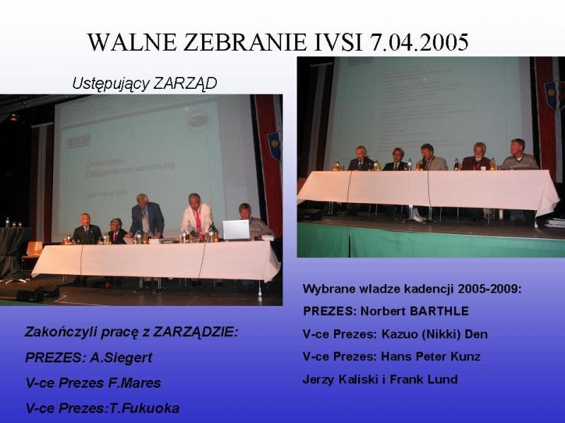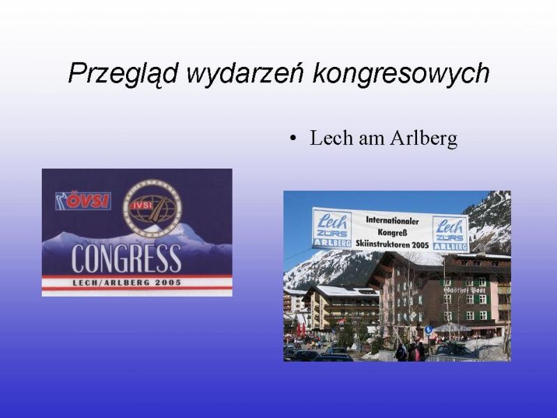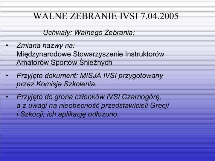Zebranie prowadził IW Piotr Nowacki -Przewodniczący KLSN. Przedstawił opracowane przez BIURO  podsumowanie minionego sezonu narciarskiego 2004/2005 –  zaprezentowano analizę kursów, zawodów i egzaminów regionalnych. Kolejnym tematem była prezentację multimedialna „Przegląd wydarzeń kongresowych IVSI 2005 Lech”, której slajdy można obejrzec na naszej stronie.