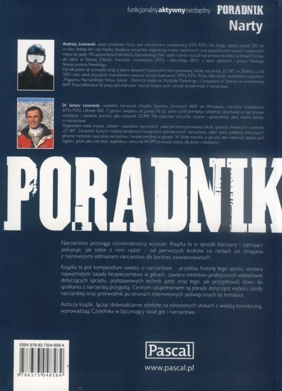 Tuż przed sezonem na rynku wydawniczym ukazała się książka z serii biblioteki Pascala „Poradnik Narty”. Autorzy Andrzej Lesiewski i Janusz Lesiewski systematycznie wprowadzają czytelnika w świat gór i sportów śnieżnych. Od historii do najnowszych odmian narciarstwa dla bardziej zaawansowanych, poprzez technikę, nauczanie dzieci i dorosłych, bezpieczeństwo, sprzęt a nawet rozdział „Narty w sieci”. W Poradniku znajdziemy też artykuł o SITN-PZN i licencjonowanych Szkołach Narciarskich. Tym, którym nasze „ośle łączki” nie wystarczają Poradnik oferuje wspaniałe fotografie. Narciarstwo w obiektywie w Poradniku to więcej niż sztuka to fascynacja.