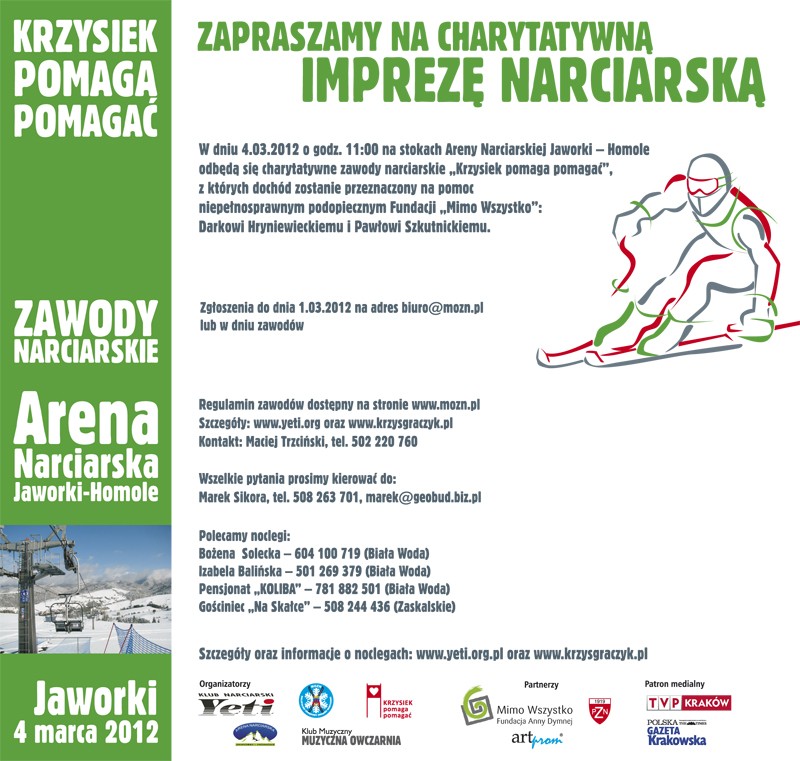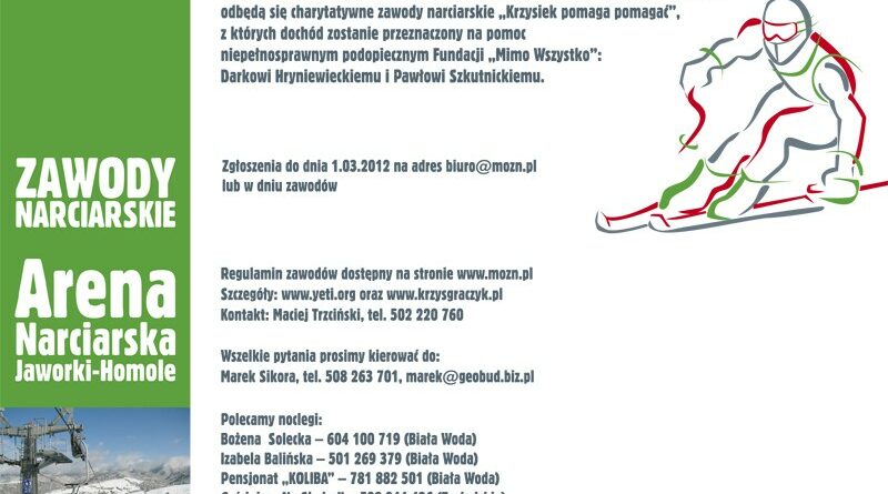 w dniu 4 marca 2012r. o godz. 11:oo na stokach Areny Narciarskiej Jaworki-Homole odbędą się charytatywne zawody narciarskie ” Krzysiek pomaga pomagać”, z ktorych dochod zostanie przeznaczony na pomoc niepełnosprawnym podopiecznym Fundacji „Mimo wszystko”: Darkowi Hryniewieckiemu i Pawłowi Szkutnickiemu.