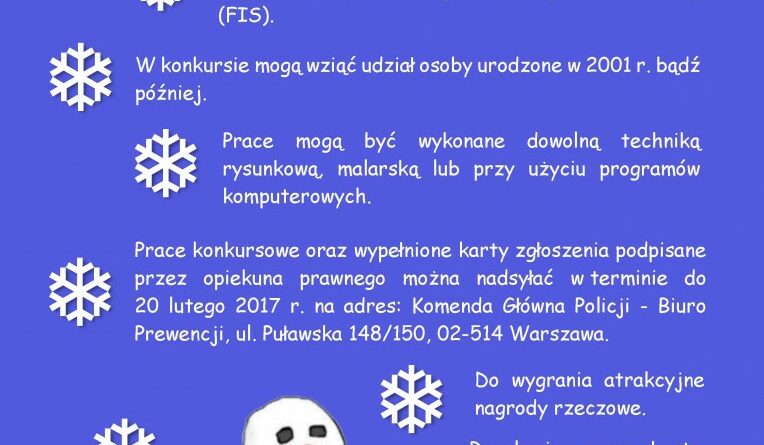 Warunkiem uczestnictwa w konkursie jest nadesłanie do 20 lutego 2017 r. pracy plastycznej w formacie od A-5 do A-3, wykonanej dowolną techniką rysunkową, malarską lub przy użyciu programów komputerowych oraz wypełnionej karty zgłoszenia podpisanej przez opiekuna prawnego na adres: Komenda Główna Policji – Biuro Prewencji, ul. Puławska 148/150, 02-514 Warszawa.