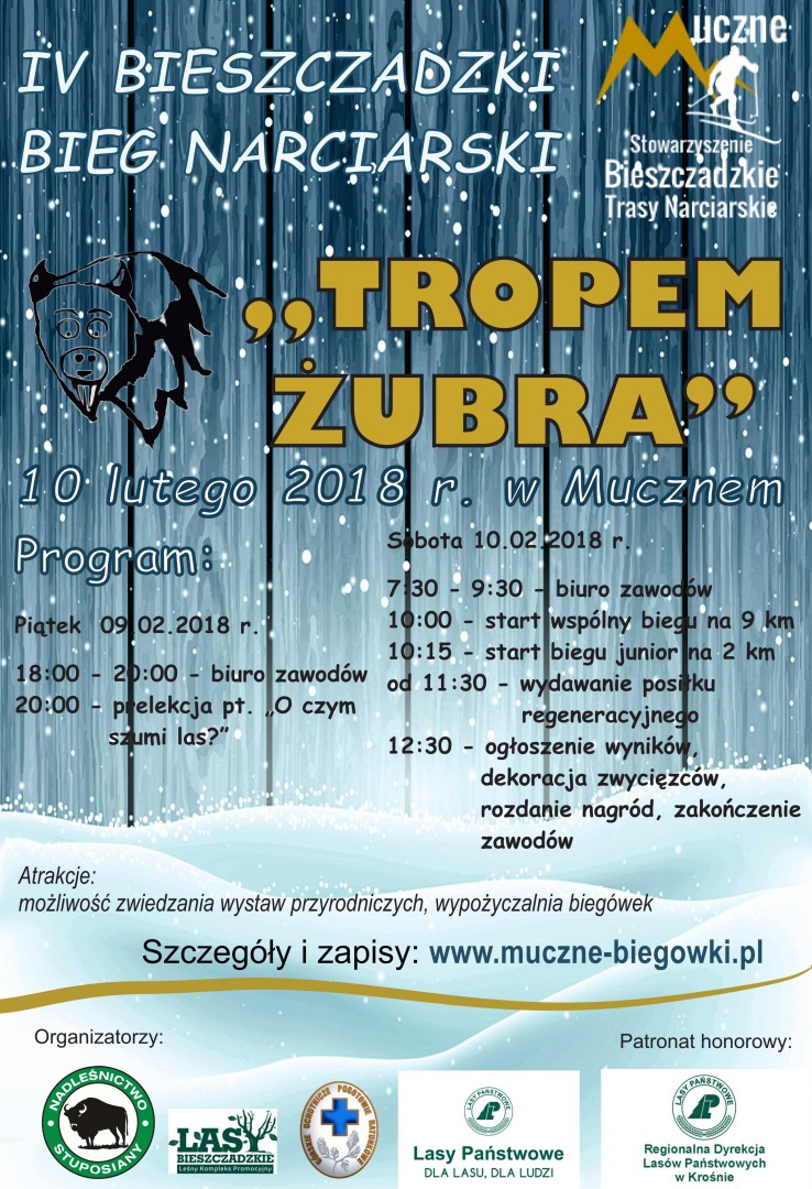 Stowarzyszenie Bieszczadzkie Trasy Narciarskie oraz Nadleśnictwo Stuposiany organizują IV edycję Bieszczadzkiego Biegu Narciarskiego „Tropem Żubra”, który odbędzie się 10 lutego 2018 r w Mucznem. Zawody będą przeprowadzone na profesjonalnie przygotowanych trasach do narciarstwa biegowego, które są zlokalizowane wokół miejscowości. Zapraszamy amatorów jak i profesjonalistów. Zapisy na zawody są przeprowadzane na stronie Stowarzyszenia Bieszczadzkie Trasy Narciarskie www.muczne-biegowki.pl. Na wszystkich uczestników czeka moc atrakcji i niezapomniane przeżycia. Oprócz zawodów będzie możliwość zwiedzenia wystawy przyrodniczej z typową fauną i florą dla regionu Bieszczadów czy Zagrody Pokazowej Żubrów. Wszystkie informacje na temat zawodów pojawiają się na funpage Nadleśnictwa Stuposiany i Centrum Promocji Leśnictwa na Facebooku oraz w wydarzeniu „IV Bieszczadzki Bieg Narciarski „Tropem Żubra””. Warunki atmosferyczne sprzyjają temu, by założyć narty i wyruszyć na trasę, tak więc raz jeszcze wszystkich serdecznie zapraszamy!