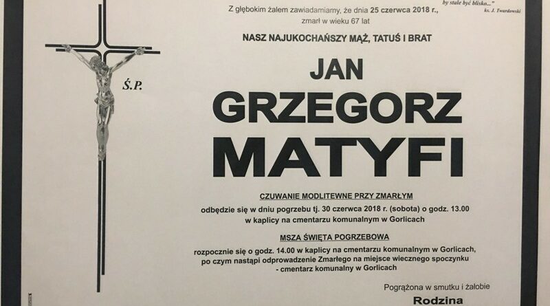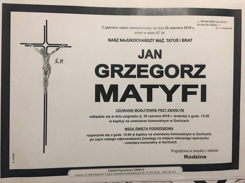 Uroczystości pogrzebowe odbędą się w GORLICACH w sobotę (30.06.2018 r.) o godz. 14:oo w Kaplicy Cmentarnej na Cmentarzu Komunalnym.