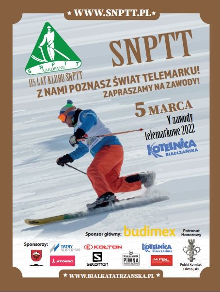 Sekcja Telemarku klubu SN PTT Zakopane 1907 organizuje w dniu 5 marca 2022 r. kolejne, już V Zawody Telemarkowe wspólnie z Ośrodkiem Narciarskim Kotelnica Białczańska. Nasze zmagania odbywają się w Światowym Dniu Telemarku, który przypada na pierwsze weekend marca. To nasz polski akcent! Po raz pierwszy zawody posiadają patronat Polskiego Komitetu Olimpijskiego Jest już tradycją, że nasze zmagania toczyć będziemy na trasie 8A. Start planujemy na godzinę 10:00. Wydawanie numerów startowych rozpoczniemy od godziny 8,30.